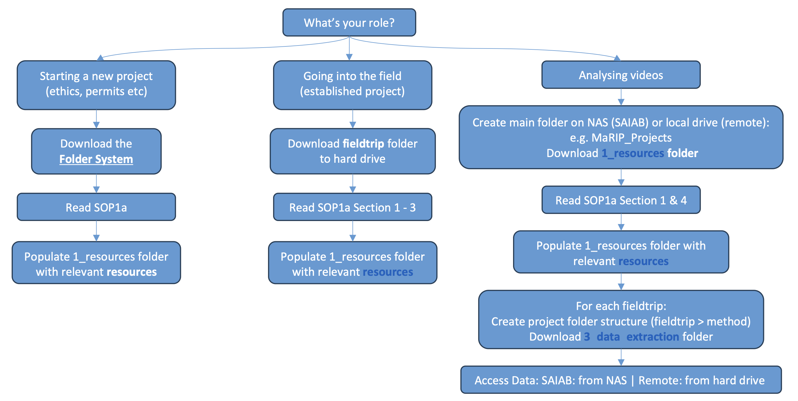 Once your folder is set up and populated, read through the SOPs you downloaded. Each SOP contains detailed step-by-step procedures for your specific role and method. If you are unsure which SOPs apply to you, refer back to the SOP Decision Tree (Figure 7) or get in touch and we will point you in the right direction.